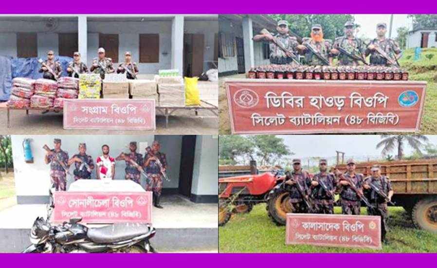 ৪৮ বিজিবি’র অধিনায়ক লেফটেন্যান্ট কর্নেল মো. হাফিজুর রহমান (পিএসসি) এক বিজ্ঞপ্তিতে জানান- ৪৮ বিজিবি’র আওতাধীন সিলেট ও সুনামগঞ্জ জেলার সীমান্তবর্তী এলাকায় বুধবার ও বৃহস্পতিবার অভিযান চালিয়ে ৫৪ পিস লেহেঙ্গা, ২২ পিস ভারতীয় শাড়ী, ২৮ পিস সানগ্লাস, ২ হাজার ১৫৯ পিস সাবান, ৩৭৮ পিস এলোভেরা জেল, ১৯১ বোতল মদ, ১০০ পিস ইয়াবা ট্যাবলেট, মহিন্দ্রা ট্রাক্টর-১ টি, ২ টি মোটরসাইকেল, ৪৯৬ কেজি বাংলাদেশী রসুন এবং অবৈধভাবে পাথর উত্তোলনকারী নৌকা-১১ টিসহ অন্যান্য ভারতীয় পণ্য জব্দ করা হয়েছে।