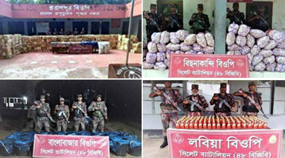 শুক্র (২৫ অক্টোবর) ও শনিবার (২৬ অক্টোবর) সিলেট ও সুনামগঞ্জের পৃথক স্থানে অভিযান পরিচালনা করে এসব পণ্য জব্দ করে বিজিবি।