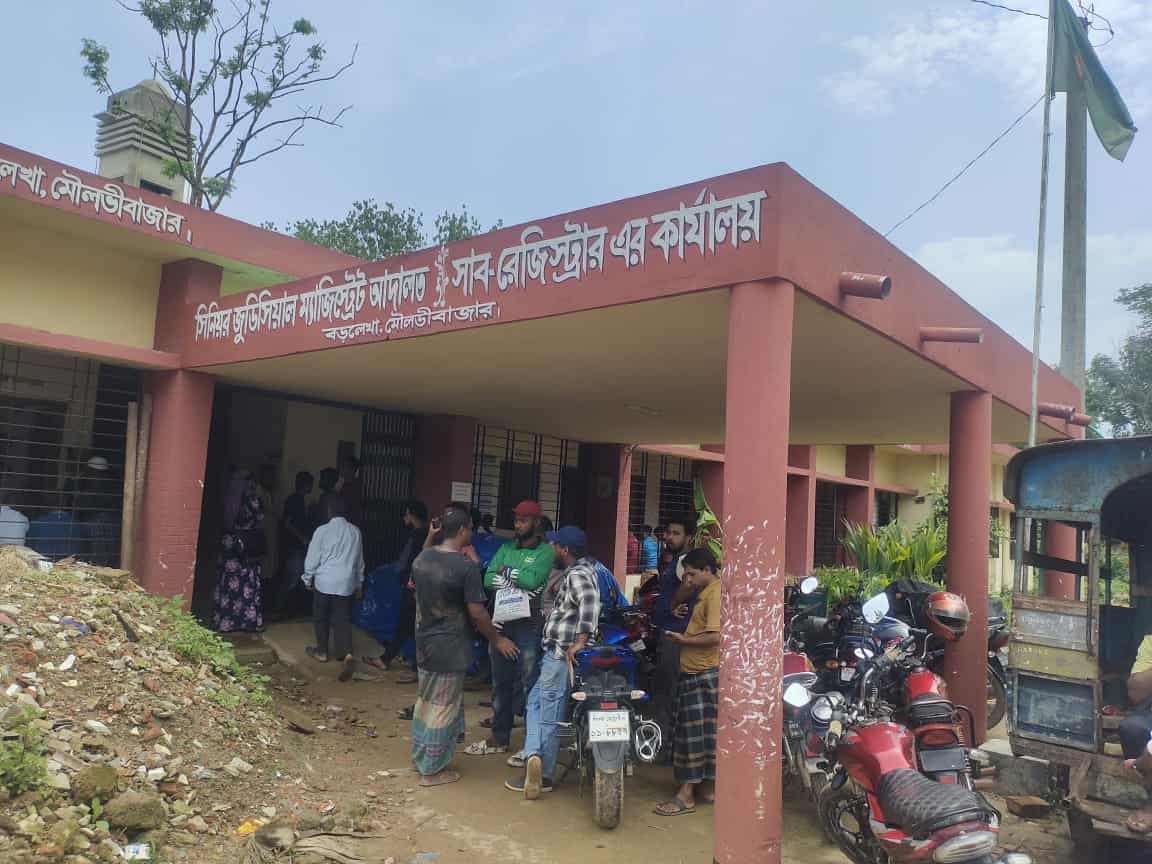 সরেজমিন ঘুরে দেখা যায়, একটি পুরনো জরাজীর্ণ ভবনের একপাশে আদালত ও অন্যপাশে উপজেলা সাব রেজিস্ট্রারের কার্যালয়। আদালতের সামনে বালুপাথরের স্তুপ। চারদিকে ময়লা আবর্জনায় ভরপুর। বারান্দায় মানুষ গিজগিজ করছে।