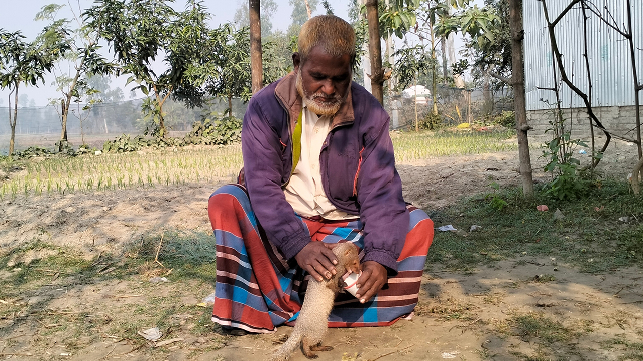 কুড়িগ্রামের উলিপুর পৌরসভার রাজারাম ক্ষেত্রী গ্রামের শুকুর আলীর ছেলে দুলাল মিয়া তিন বছর আগে জঙ্গল থেকে একটি বেজির বাচ্চা ধরে নিয়ে আসেন বাড়িতে। এরপর তার বাবা শুকুর আলী বাচ্চাটিকে খাঁচায় রেখে খাওয়ান। আদর করে নাম রেখেছেন রুপালি।