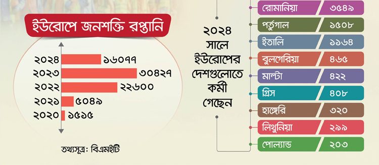 ২০২৪ সালে কাজের উদ্দেশ্যে বাংলাদেশ থেকে বিদেশে যান ১০ লাখ ১১ হাজার ৯৬৯ জন বাংলাদেশি। এর মধ্যে ইউরোপে ১৬ হাজার ৭৭ জন। ২০২৪ সালে কাজের উদ্দেশ্যে ইউরোপের ২৮টি দেশে যাওয়া কর্মীদের মধ্যে উল্লেখযোগ্যভাবে ইতালি গেছেন ১ হাজার ১৬৪ জন, বুলগেরিয়ায় ৪৬৫, ক্রোয়েশিয়ায় ৩ হাজার ৯৪৬, গ্রিসে ৪০৮, হাঙ্গেরিতে ৩২০, লিথুনিয়ায় ২৯৯, মাল্টায় ৪২২, পর্তুগালে ১৫০৮, পোল্যান্ডে ২০৩, রোমানিয়ায় ৩ হাজার ৫৪৯, সার্বিয়ায় ৮৭, ফিনল্যান্ডে ৩৫ জন ও আয়ারল্যান্ডে গেছেন ২২ জন। এছাড়া চেক রিপাবলিক, ডেনমার্ক, এস্তোনিয়া, বেলজিয়াম ও অস্ট্রিয়ায় কাজের উদ্দেশে কর্মীরা গেছেন।