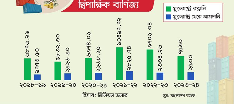 বাংলাদেশ ব্যাংকের তথ্য অনুযায়ী, ২০২৩-২৪ অর্থবছরে বাংলাদেশ-মার্কিন দ্বিপাক্ষিক বাণিজ্য ছিল ১০ দশমিক ১৩ বিলিয়ন ডলার। যার মধ্যে যুক্তরাষ্ট্রের বাজারে বাংলাদেশের রপ্তানি ছিল ৭ দশমিক ৫৯ বিলিয়ন ডলার এবং দেশ থেকে আমদানি ছিল ২ দশমিক ৫৩ বিলিয়ন ডলার।