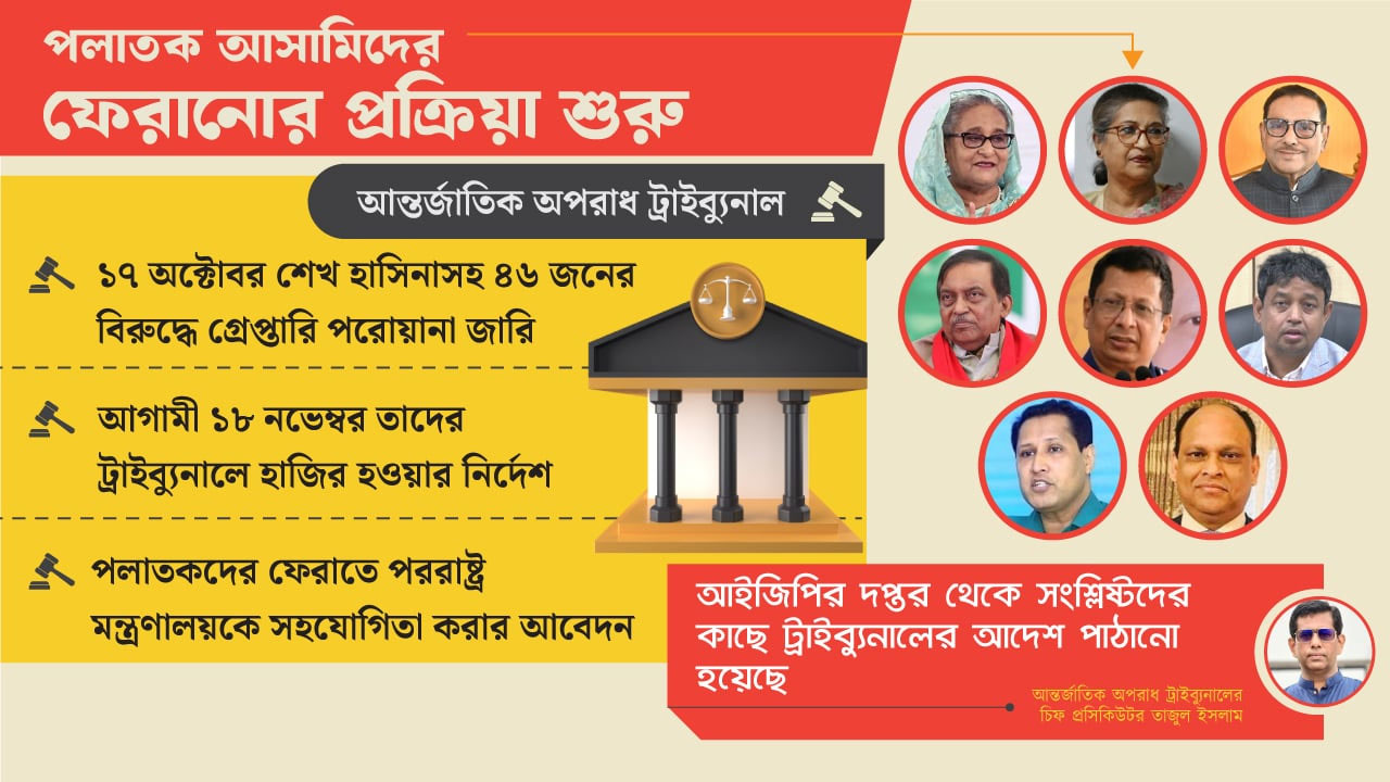তাদের দেশে ফেরানোটা কি শুধু ‘প্রক্রিয়ার মধ্যে বন্দি’, নাকি আদতে কোনো উদ্যোগ নেওয়া হয়েছে— জানতে চাইলে আন্তর্জাতিক অপরাধ ট্রাইব্যুনালের প্রসিকিউটর (প্রশাসন) গাজী এম এইচ তামিম ঢাকা পোস্টকে বলেন, ট্রাইব্যুনাল শেখ হাসিনাসহ ৪৬ জনের বিরুদ্ধে গ্রেপ্তারি পরোয়ানা জারি করেছেন। ১৮ নভেম্বর তাদের হাজির করতে নির্দেশ দেওয়া হয়েছে। ট্রাইব্যুনাল থেকে আদেশের অনুলিপি আইজিপির কাছে পাঠানো হয়েছে। আমরা জেনেছি, আইজিপির দপ্তর থেকে সংশ্লিষ্টদের কাছে ট্রাইব্যুনালের আদেশ পাঠানো হয়েছে।