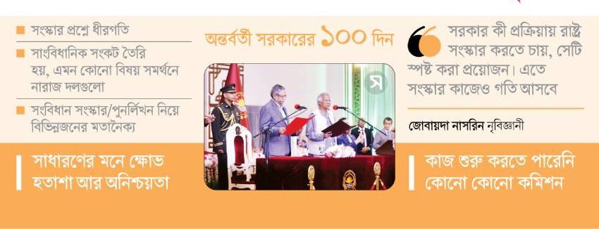 অন্তর্বর্তী সরকারের ১০০ দিন পার হওয়ার পর কতদিন ক্ষমতায় থেকে তারা কী প্রক্রিয়ায় রাষ্ট্র সংস্কার করতে চায়, সেটি স্পষ্ট করা হয়নি। সংবিধান বাতিল কিংবা রাষ্ট্রপতির পদত্যাগ ইস্যুতে রাজনৈতিকভাবে বিরোধিতার মুখে পড়ে ছাত্র-জনতার অভ্যুত্থানে নেতৃত্ব দেওয়া বৈষম্যবিরোধী ছাত্র আন্দোলন। রাজনৈতিক দলগুলোর মধ্য থেকেও কেউ কেউ সংস্কার প্রক্রিয়ায় ধীরগতির অভিযোগ তুলেছে। অনেক সংস্কার কমিশন এখনও কাজ শুরু করতে পারেনি। এমন পরিস্থিতিতে বিএনপিসহ বেশ কয়েকটি দল দ্রুত সংস্কার শেষ ও নির্বাচনি রোডম্যাপ ঘোষণার দাবি তুলছে। রাজনৈতিক বিশ্লেষকরা বলছেন, শেখ হাসিনার পতনের পর মানুষ দ্রুত কিছু ইতিবাচক পরিবর্তন দেখার অপেক্ষায় ছিল, কিন্তু সরকার তাদের সেই আকাক্সক্ষা পূরণে ব্যর্থ হয়েছে।