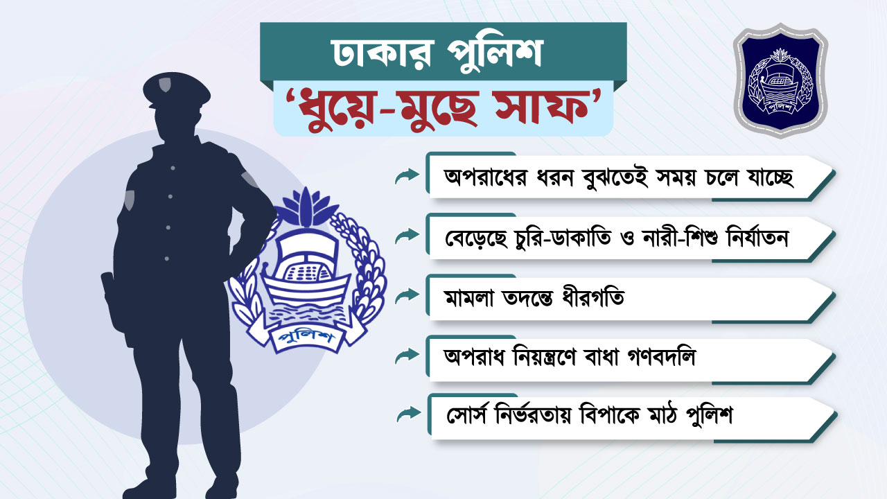 পুলিশের ক্রাইম ডিভিশনে কর্মরত এক কর্মকর্তা বলেন, ‘বলা যায় ধুয়ে-মুছে সাফ করা হয়েছে ঢাকার পুলিশ। এখন বেশিরভাগই নতুন কর্মকর্তা। জেলা শহরের অপরাধের ধরন এবং ঢাকার অপরাধের ধরন আলাদা। অপরাধের ধরন বুঝতেই সময় চলে যাচ্ছে। খাপ খাইয়ে নিতে সময় লাগছে।’