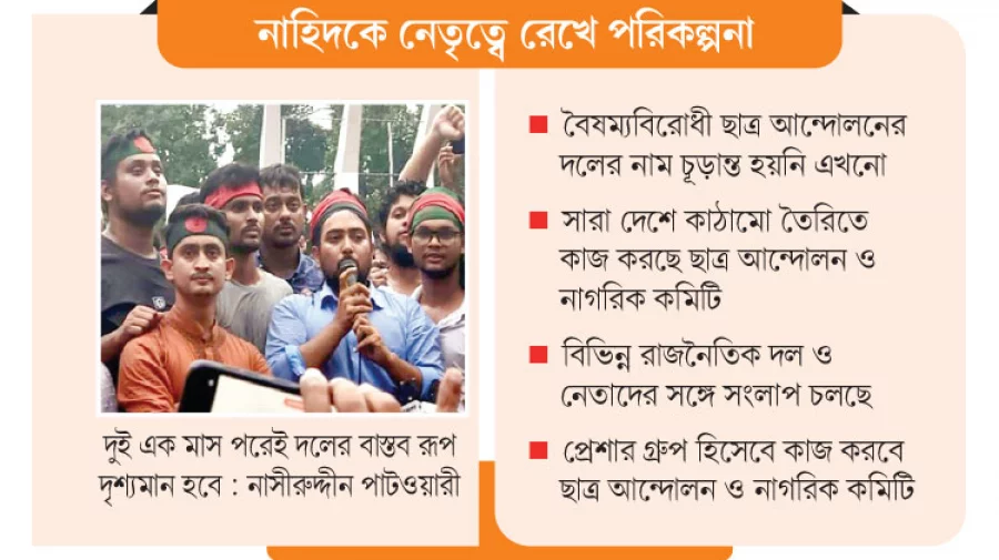 নাম প্রকাশ না করে জাতীয় নাগরিক কমিটির শীর্ষপর্যায়ের এক নেতা বলেন, ‘নাহিদ ইসলামকে সামনে রেখে আমরা জানুয়ারিতে দল গঠনের বিষয়ে ভাবছি। সে ক্ষেত্রে তাকে দল গঠনের আগে উপদেষ্টার পদ ছাড়তে হবে। সবকিছু চূড়ান্ত হলে আমরা আশা করি, সেটি তিনি করবেন। নাগরিক কমিটি ঢাকাসহ দেশের সব থানাপর্যায়ে কমিটি ও বৈষম্যবিরোধী ছাত্র আন্দোলন জেলাপর্যায়ে কমিটি করার কাজ করছে। জানুয়ারির মধ্যেই সেটি সম্পন্ন হয়ে যাবে বলে আমরা আশাবাদী।’