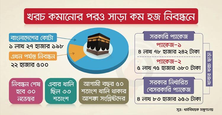 চলতি বছর হজে যেতে গত ১ সেপ্টেম্বর থেকে শুরু হয় হজের প্রাথমিক নিবন্ধন। শুরুর পর দু-একজন করে নিবন্ধন করছিলেন। তখন এজেন্সিগুলোর পক্ষ থেকে বলা হয়, হজের খরচ কত হচ্ছে সেটা না জানলে মানুষ নিবন্ধন করবে না, প্যাকেজ ঘোষণা হলে নিবন্ধনের হার বাড়বে। আগামী বছর হজের খরচ একলাখ টাকা কমছে। কিন্তু প্যাকেজ ঘোষণার একমাস হলেও নিবন্ধনে সাড়া মেলেনি। আর পাঁচদিন বাকি থাকলেও কোটার মাত্র ১৮ শতাংশ পূরণ হয়েছে।