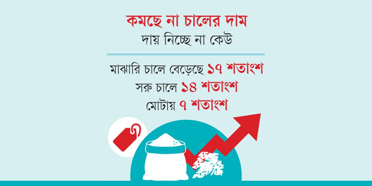 আমনের ভরা মৌসুমেও বাড়ছে চালের দাম। এক বছরের ব্যবধানে সরু চালের দাম বেড়েছে ১৪ শতাংশ, মাঝারি ১৭ শতাংশ এবং মোটা ৭ শতাংশ। খুচরা ও পাইকারি চাল বিক্রেতারা বলছেন, মিলাররা বেশি করে ধান গুদামে মজুত করে ইচ্ছামতো বাড়াচ্ছেন চালের দাম। গোডাউনে অভিযান না চালালে কমবে না দাম। মিলাররা বলছেন, হাটবাজারে ফড়িয়ারা (মধ্যস্বত্বভোগী) বেশি করে ধান মজুত করায় বাড়ছে দাম। এ অবস্থায় ভোক্তাদের পকেট খালি হলেও কেউ দায় নিচ্ছে না।