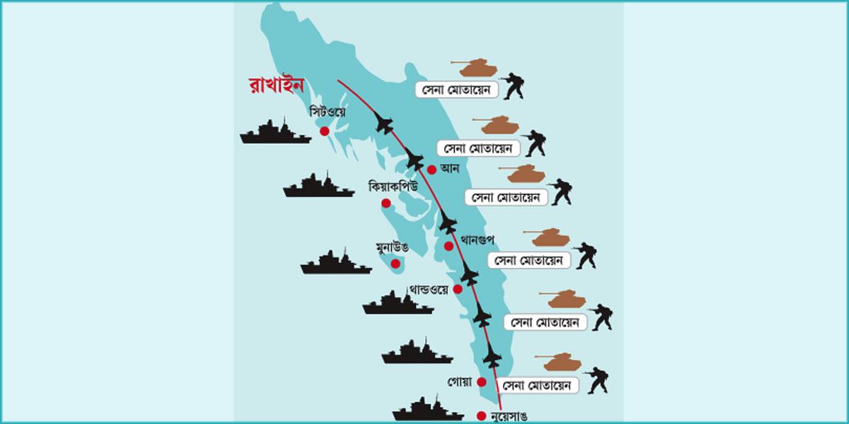 বাংলাদেশের সীমান্তবর্তী মায়ানমারের রাখাইন রাজ্য দখল করে নেওয়া আরাকান আর্মির (এএ) বিরুদ্ধে ব্যাপক যুদ্ধের প্রস্তুতি নিচ্ছে দেশটির সেনাবাহিনী। এ লক্ষ্যে দেশটির সমুদ্র উপকূলীয় এলাকা বরাবর সিটওয়ে থেকে নুয়েসং পর্যন্ত ৬টি স্থানে নৌবাহিনীর যুদ্ধজাহাজ মোতায়েন করেছে মায়ানমারের জান্তা সরকার। অন্যদিকে মাগওয়ে থেকে পাথেইন পর্যন্ত আরও ৬টি স্থানে সেনা সমাবেশ বাড়াচ্ছে দেশটির সরকার। মাঝখানে রাখাইন ইয়োমা পর্বতমালার শীর্ষ ভাগে অবস্থান করছে আরাকান আর্মি। নৌবাহিনী ও স্থলবাহিনীর পাশাপাশি বিমানবাহিনীর যুদ্ধবিমান দিয়েও ব্যাপক আক্রমণের পরিকল্পনা করছে দেশটির জান্তা সরকার। উদ্দেশ্য আগামী মার্চের মধ্যে অর্থাৎ বর্ষা শুরুর আগেই রাখাইন থেকে আরাকান আর্মিকে তাড়িয়ে দেওয়া। সংশ্লিষ্ট কূটনৈতিক ও গোয়েন্দা সূত্রে এসব তথ্য জানা গেছে।