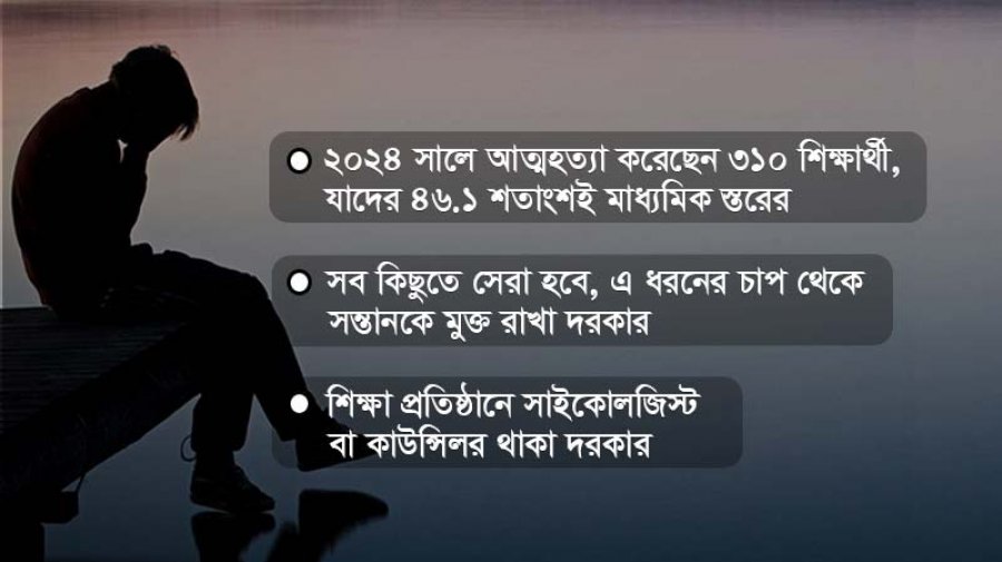 জরিপ বলছে, মাধ্যমিকের শিক্ষার্থীদের মাঝে আত্মহত্যার প্রবণতা বেশি। আঁচল ফাউন্ডেশনের জরিপের তথ্যমতে, দেশে ২০২৪ সালে স্কুল, কলেজ ও বিশ্ববিদ্যালয়সহ বিভিন্ন পর্যায়ে ৩১০ জন শিক্ষার্থী আত্মহত্যা করেছেন— যার মধ্যে ৪৬ দশমিক ১ শতাংশই মাধ্যমিক স্তরের শিক্ষার্থী। প্রতিবেদনে বলা হয়, ২০২৪ সালের আত্মহত্যার তথ্য বিগত বছরগুলোর সঙ্গে তুলনা করেছে তারা। সেখানে দেখা যায়, ২০২২ সালে দেশে স্কুল, কলেজ ও বিশ্ববিদ্যালয়ের আত্মহত্যাকারী শিক্ষার্থীর সংখ্যা ৫৩২ জন। ২০২৩ সালে ছিল ৫১৩ জন। সদ্য বিদায়ী ২০২৪ সালে আত্মহত্যাকারী মোট শিক্ষার্থীর সংখ্যা ৩১০ জন। তাদের মধ্যে স্কুল, কলেজ, মাদ্রাসা ও বিশ্ববিদ্যালয়ের শিক্ষার্থী রয়েছেন। সমাজবিশ্লেষকরা বলছেন, এ সময়টা বয়ঃসন্ধিকাল। কিশোর-কিশোরীদের মধ্যে নানা ধরনের পরিবর্তন ঘটে। যারা সেই পরিবর্তনগুলোর সঙ্গে খাপ খাইয়ে নিয়ে যৌক্তিক আচরণ শিখতে পারেন না, তারা আত্মহত্যার পথ বেছে নেন।