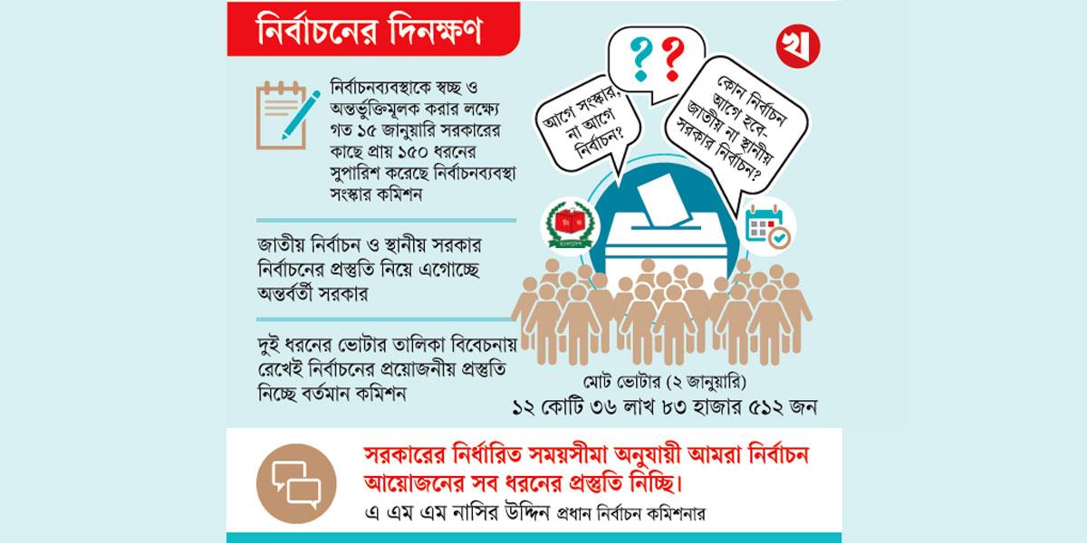প্রধান উপদেষ্টার নির্দেশনা অনুসরণ করলেও জাতীয় সংসদ নির্বাচনের দিনক্ষণ প্রশ্নে দুই ধরনের প্রস্তুতি নিয়ে এগোচ্ছে নির্বাচন কমিশন (ইসি)। প্রথমত নির্বাচন এ বছরের ডিসেম্বর বা ২০২৬-এর জানুয়ারিতে অনুষ্ঠিত হলে আগামী ২ মার্চ প্রকাশিতব্য ভোটার তালিকা অনুযায়ী হবে। আরও পিছিয়ে নির্বাচন আগামী ২০২৬-এর মধ্যভাগে চলে গেলে সে ক্ষেত্রে পরবর্তী হালনাগাদ ভোটার তালিকা অনুযায়ী অনুষ্ঠিত হবে।