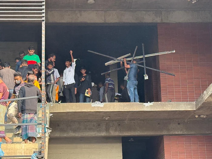 সরেজমিন দেখা গেছে, পেছনের ওই ছয়তলা ভবনে শত শত মানুষ ঢুকছেন। কেউ কেউ ভেতর থেকে জিনিসপত্র নিয়ে বেরিয়ে আসছেন। আর ভবনটির ভেতর থেকে হাতুড়ির আঘাতে নানা কিছু ভাঙার শব্দ শোনা যাচ্ছে।