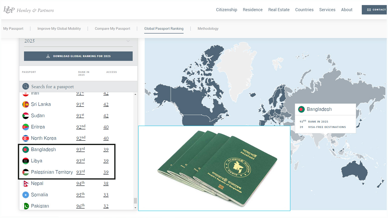 ২০২৫ সালের সূচকে বাংলাদেশের পাসপোর্ট যুদ্ধবিধ্বস্ত ফিলিস্তিন ও লিবিয়ার সঙ্গে যৌথভাবে ৯৩তম অবস্থানে রয়েছে। চলতি বছরের সংস্করণ অনুযায়ী, বাংলাদেশের পাসপোর্ট দিয়ে বিশ্বের ২২৭টি গন্তব্যের মধ্যে বর্তমানে ৩৯টিতে ভিসা ছাড়া কিংবা অন অ্যারাইভাল ভিসায় ভ্রমণ করা যায়।