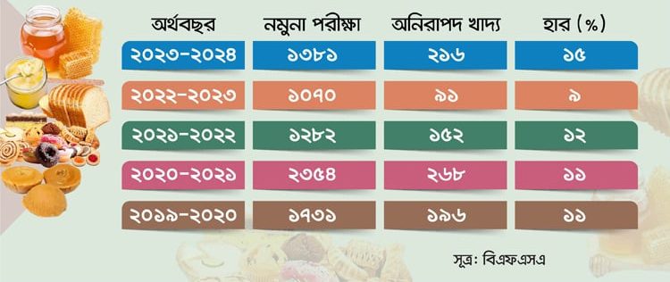 আবার এ সংস্থার প্রতিবেদনই বলছে, দেশে দিন দিন অনিরাপদ খাদ্যের সংখ্যা বাড়ছে। বিগত পাঁচ বছরে দেশে যত সংখ্যক খাদ্যের নমুনা পরীক্ষা করেছে বিএফএসএ, এর মধ্যে সবচেয়ে বেশি অনিরাপদ খাদ্য মিলেছে গত অর্থবছরে (২০২৩-২৪)।