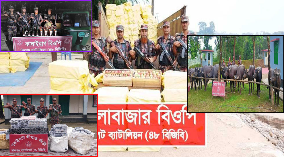 এদিকে বিজিবি ১৯ ব্যাটালিয়নের অধিনায়ক লেফটেন্যান্ট কর্নেল খন্দকার মো. আসাদুন্নবি (পিএসসি) এক বিজ্ঞপ্তিতে জানান, সিলেটের জৈন্তাপুর, কানাইঘাট ও জকিগঞ্জ সীমান্তে পৃথক ৫ অভিযানে ৫১ লাখ ২০ হাজার ১০০ টাকার ভারতীয় চোরাই পণ্য, যৌন উত্তেজক ট্যাবলেট, গরু ও মহিষ জব্দ করেছে বর্ডার গার্ড বাংলাদেশ (বিজিবি)। বিজিবি ১৯ ব্যাটালিয়নের কয়েকটি টিম ১১ থেকে ১৩ অক্টোবর- এই তিন দিনে অভিযানগুলো পরিচালনা করে।
