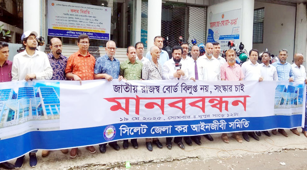 জাতীয় রাজস্ব বোর্ড বিলুপ্ত নয়, টেকসই সংস্কারের দাবিকে সামনে রেখে সিলেট জেলা কর আইনজীবী সমিতির উদ্যোগে সোমবার (১৯ মে) দুপুর সাড়ে ১২টায় মেন্দিবাগস্থ কর ভবনের সামনে এক মানববন্ধন কর্মসূচি অনুষ্ঠিত হয়।