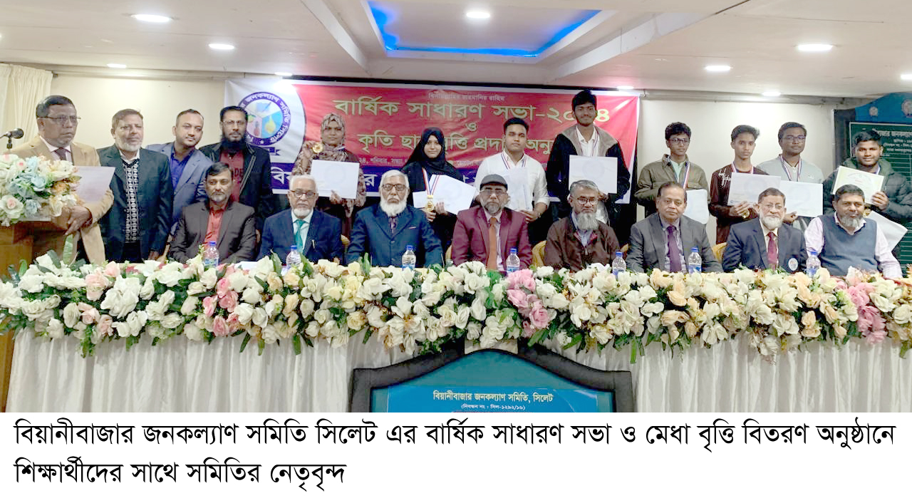 বিয়ানীবাজার জনকল্যাণ সমিতি সিলেট এর বার্ষিক সাধারণ সভা, মেধা বৃত্তি বিতরণ গত শনিবার রাত ৮টায় সিলেট নগরীর উপশহর লিংক রোডে অবস্থিত গার্ডেন টাওয়ারের অভিজাত রেস্টেুরেন্টে অনুষ্ঠিত হয়। সমিতির সভাপতি ডা. ফয়েজ আহমদের সভাপতিত্বে অনুষ্টিত সাধারণ সভায় সভাপতির বক্তব্যে বলেন, বিয়ানীবাজার জনকল্যান সমিতি সিলেট একটি স্বেচছা সেবামূলক সংগঠন। নগরীতে বসবাসরত বিয়ানীবাজার উপজেলাবাসীর বিভিন্ন পেশার জনসাধারণকে একত্রিত করে সকলের সুখে-দুঃখে অংশীদার হওয়ার পাশাপাশি জনসেবা করাই লক্ষ। সেজন্য সংগঠনকে আগামীতে আরো শক্তিশালী করার লক্ষ্যে বিয়ানীবাজারবাসী সহ সকল সচেতন মহলের সুদৃষ্টি কামনা করেন। সভাপতি বলেন, বিয়ানীবাজার জনকল্যাণ সমিতি সিলেট ১৯৬৪ সালে তৎকালীন সিলেট শহরে প্রতিষ্ঠা লাভ করে। তাই সবার ঐক্যবদ্ধ প্রচেষ্ঠায় নগরীতে উক্ত সমিতির জন্য বিয়ানীবাজার ভবন নির্মাণ করতে প্রয়োজনীয় অর্থ সংগ্রহ সহ কার্যক্রম প্রত্রিয়াধীন রয়েছে।